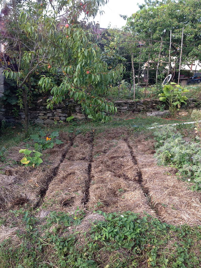 Pour ce qui est d'écarter, je pense que beaucoup ont essayé. Dont ma femme. Cela va "plus ou moins bien". Le principal défaut : le foin a tendance à reprendre sa position, et à fermer le sillon. Ou alors tu ouvres "très grand" - avec l'inconvénient que là où cela ne reprend pas sa position, les adventices en profitent.