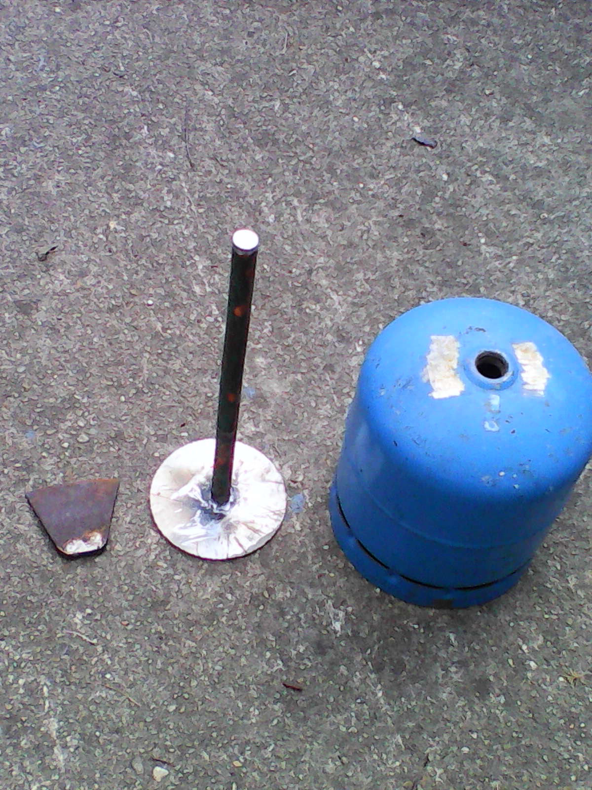 Sur la troisième photo, ce sont les éléments constitutifs: une petite bouteille de butane, dégazée dans les règles, un vieux fer de hache découpé pour conserver l'extrémité, un fer rond de 18 mm provenant d'une vieille porte extérieure et un disque qui est une chute de la découpe d'un trou circulaire (plasma).