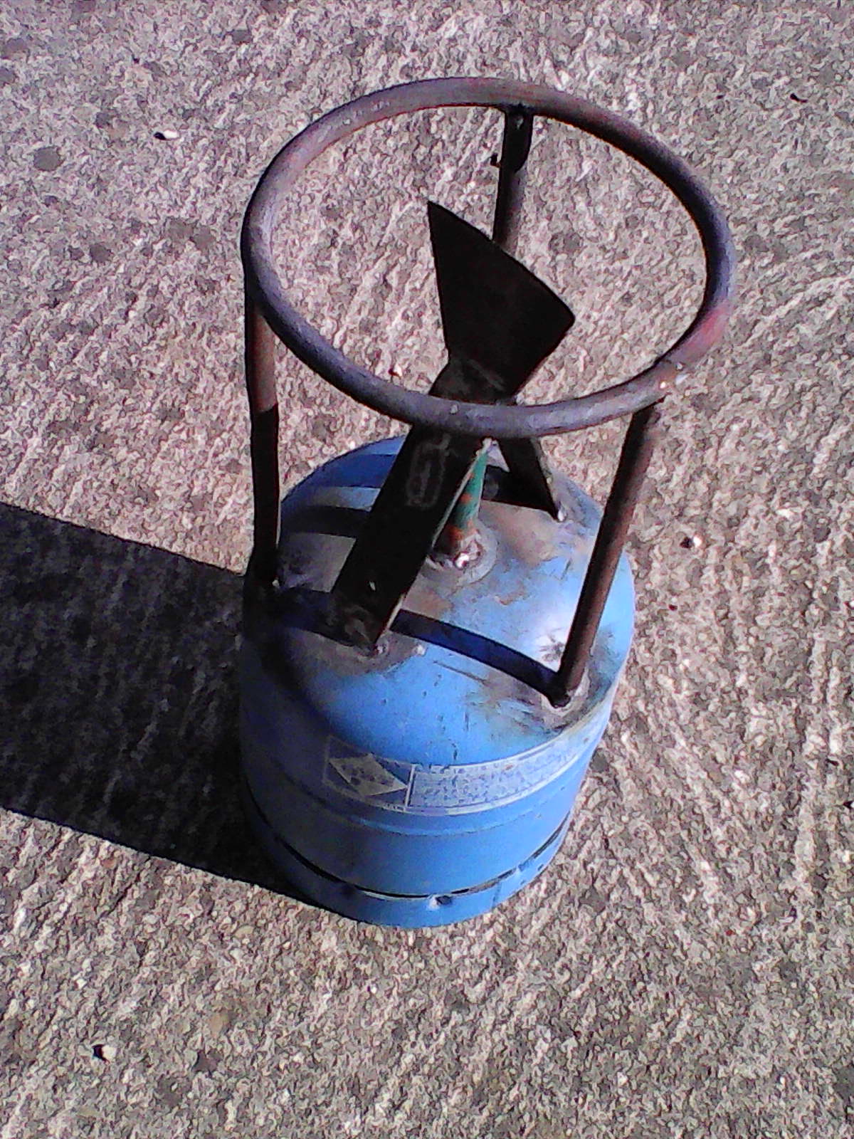 Sur la seconde, le disque préalablement soudé au pied du rond sert de pièce d'appui et repose sur le sol: le rond traverse toute la bouteille pour ressortir par l'orifice de l'ex robinet; le tout est soigneusement soudé (électrode); deux pièces en attente ont été coupées dans une vieille penture.