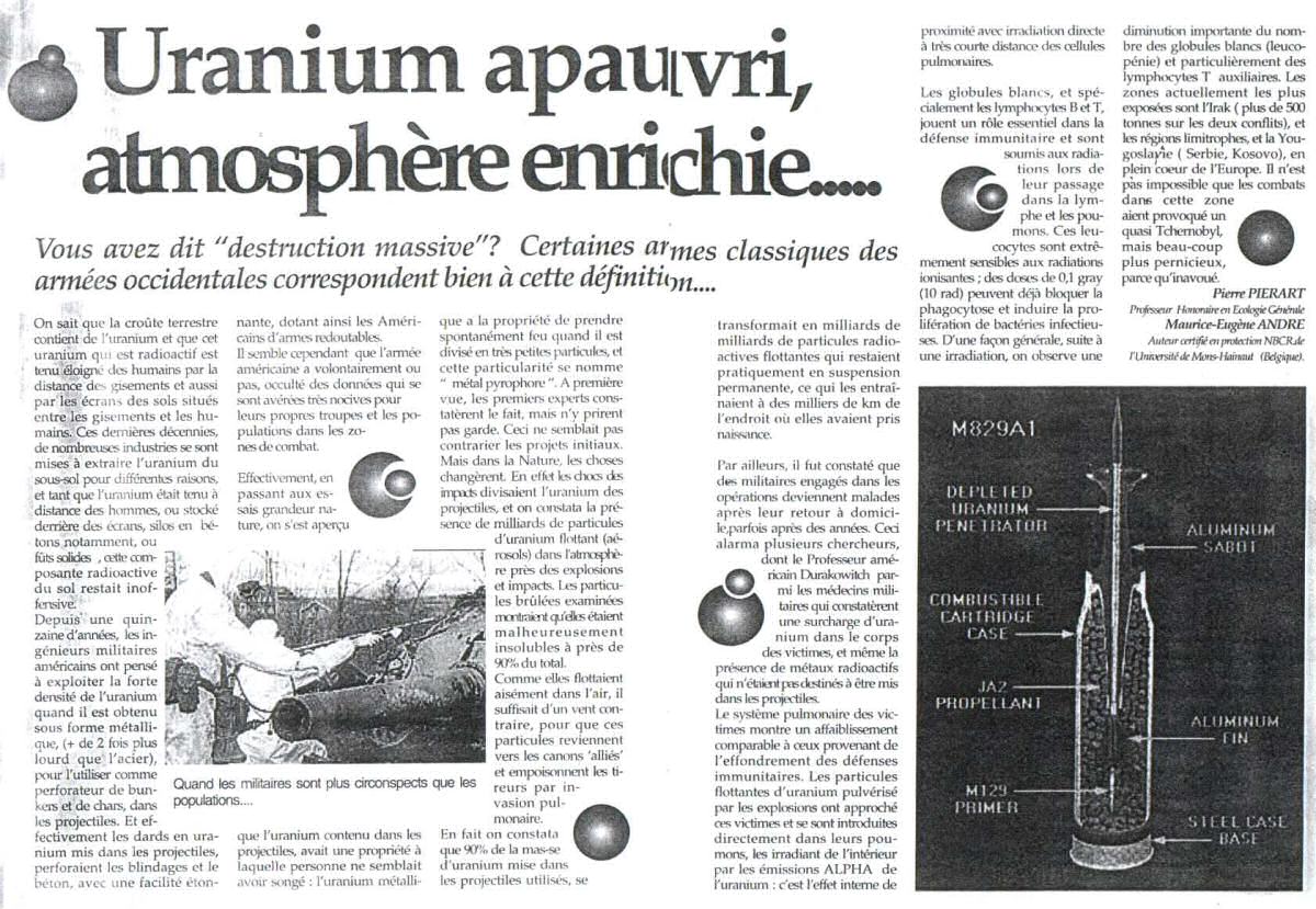 Après le Kosovo et l'Afganistan, aujourd'hui le pays irakien a aussi été victime de bombardages massifs aux armes composées d'uranium apauvri. Métal très dur composant en parti les obus flèches et très bon marché car étant un déchet difficilement recyclable.