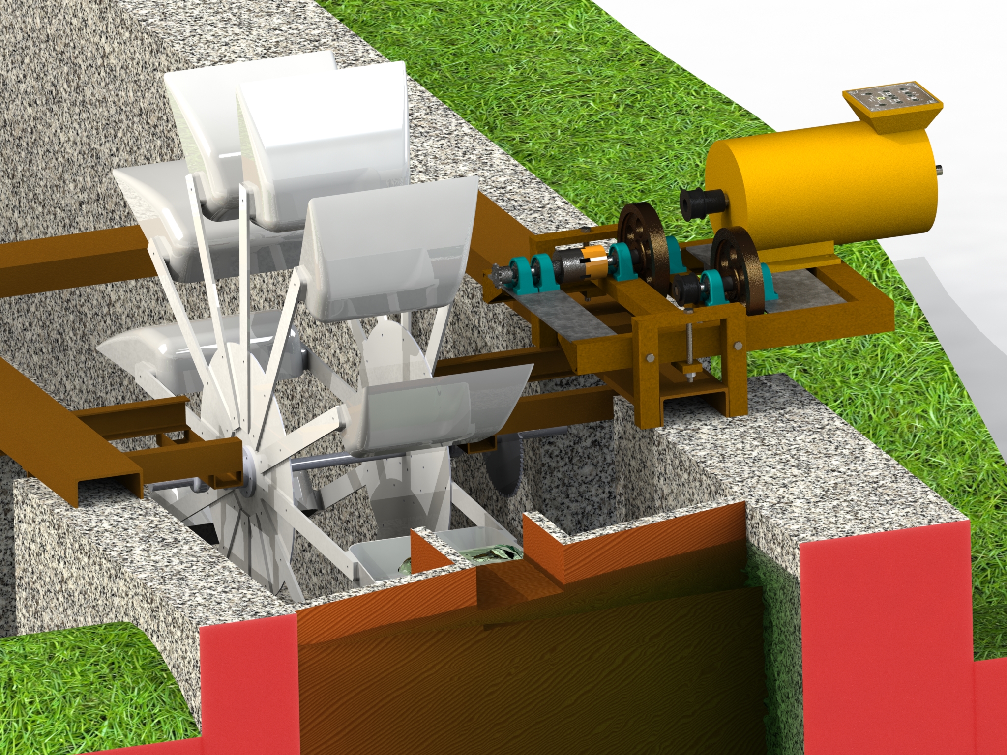 Je suis en train de réaliser une génératrice, avec une machine didactique à courant continu actionnée par une roue à aube sur un trop plein issus d'un moine de lac. (trop plein)