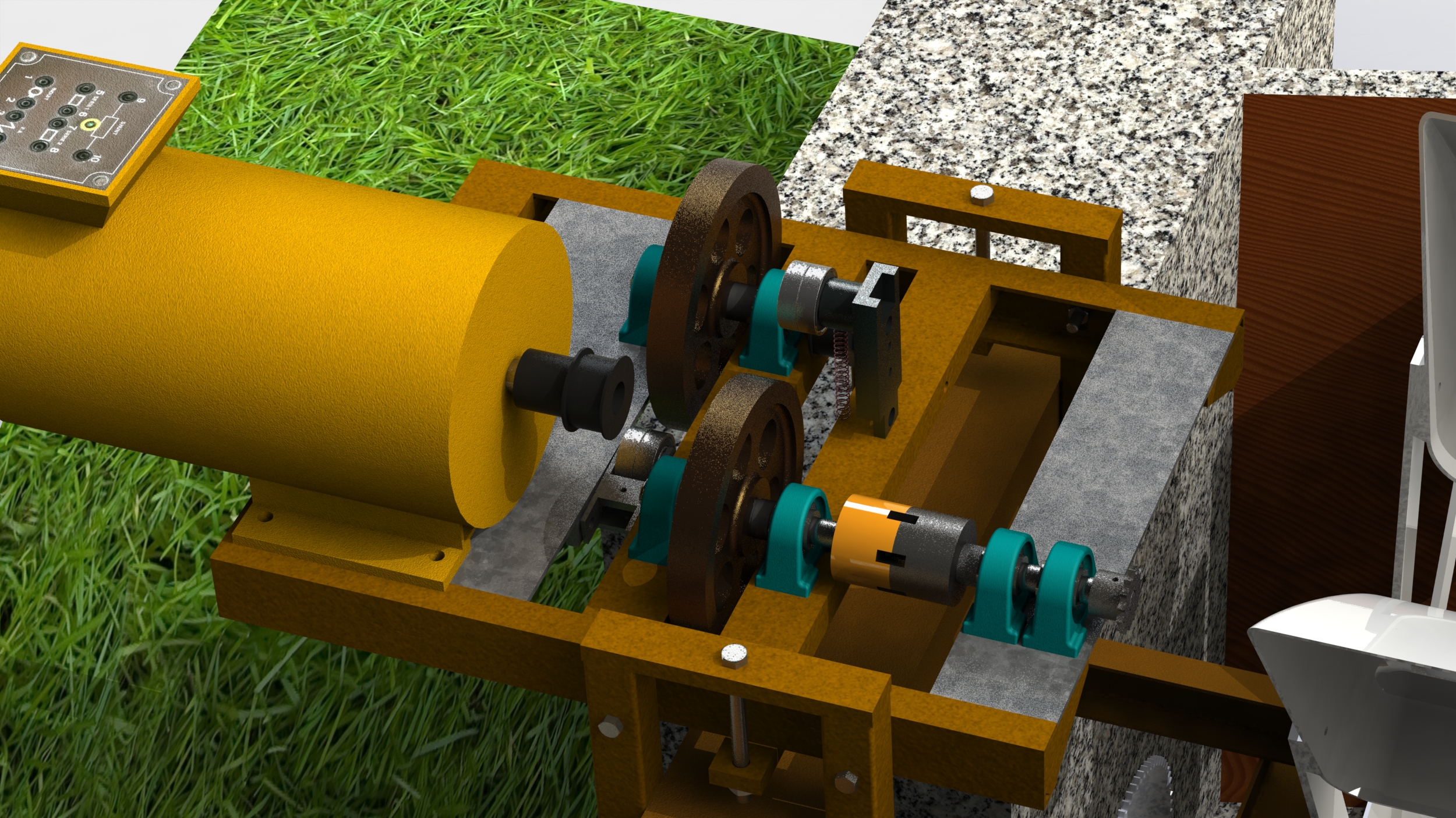 La première réalisation, abandonnée depuis, était avec un alternateur de voiture et une transmission par chaine (de vélo)