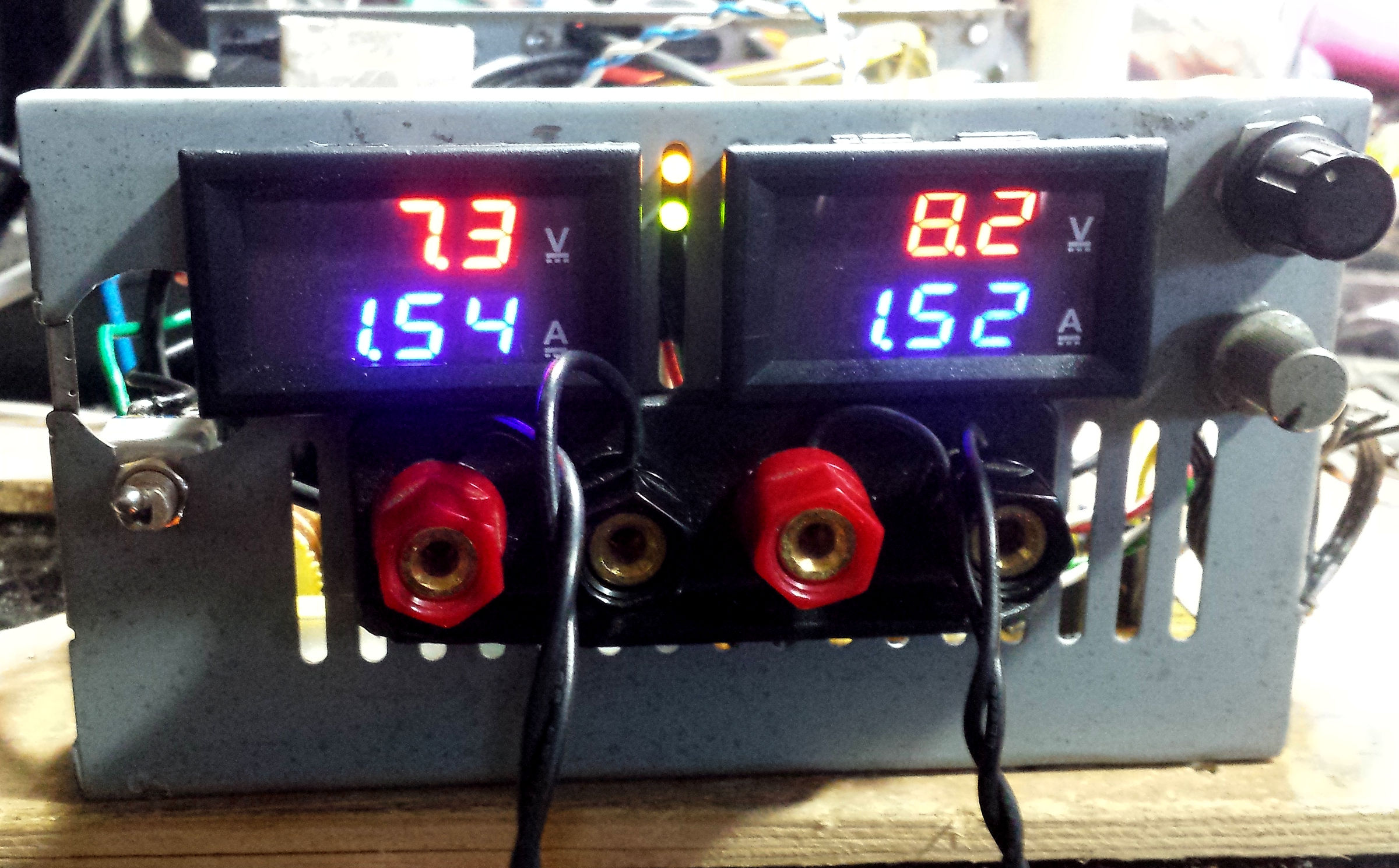 — Après essais de mon alimentation galvaniquement isolée pour alimenter mes deux volt/ampèremètres chinois, y'a eu comme un hic : l'alimentation se “fout en court-jus” dès que j'alimente les deux volt/ampèremètres (fils rouges et noirs) par le petit transfo… Grrr !