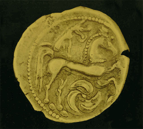Le sujet est mythique. Le triskel est un symbole de rapidité, d'encouragement à la victoire, de mouvement perpétuel. C'est donc un talisman porte-bonheur pour le cheval, et peut-étre également pour son propriétaire. Quant au loup, son importance est évidente : la position qu'il occupe appartient au domaine de la légende. La stylisation frôle ici la caricature, chère aux Gaulois.